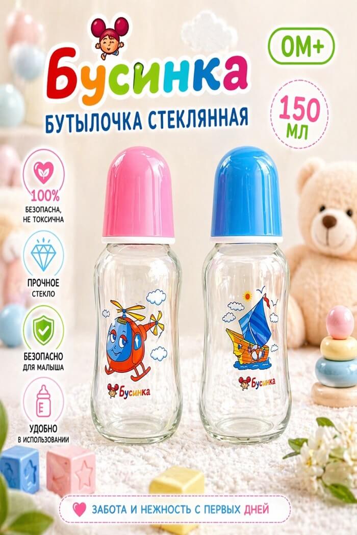 Бутылочка для кормления Бусинка 150 мл стекло (Цвет: Розовый, Рисунок: Вертолётик)