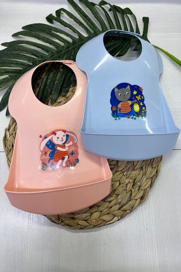 Слюнявчик пластиковый с кармашком (Цвет: Розовый, Рисунок: Зайчик)