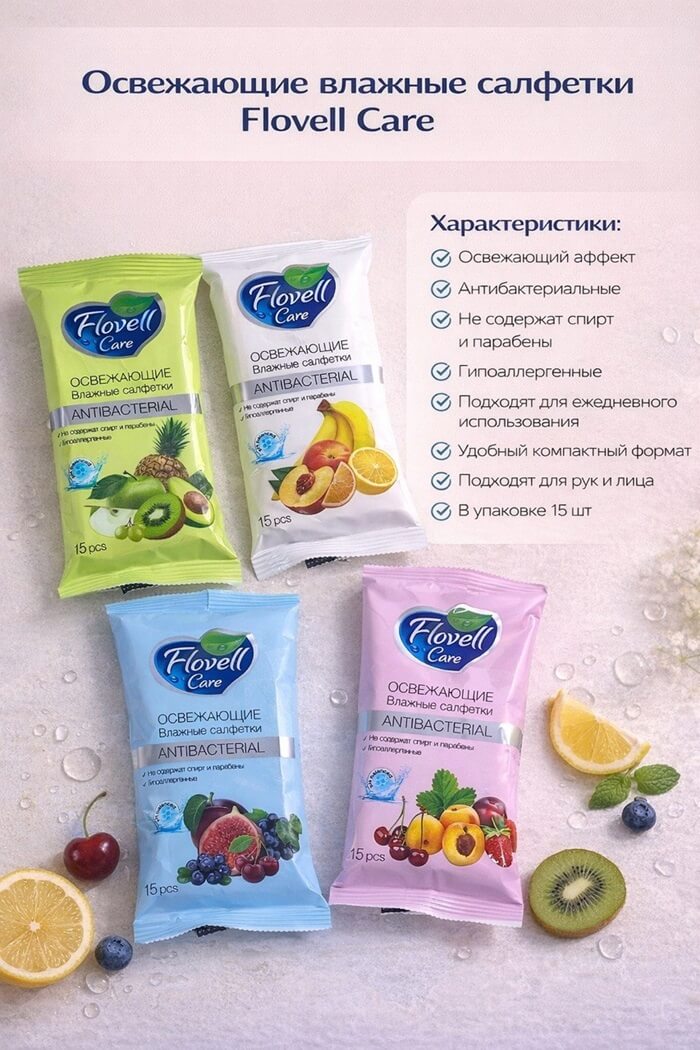 Влажные салфетки Flovell care 15шт Фрукты (Цвет: Розовый)
